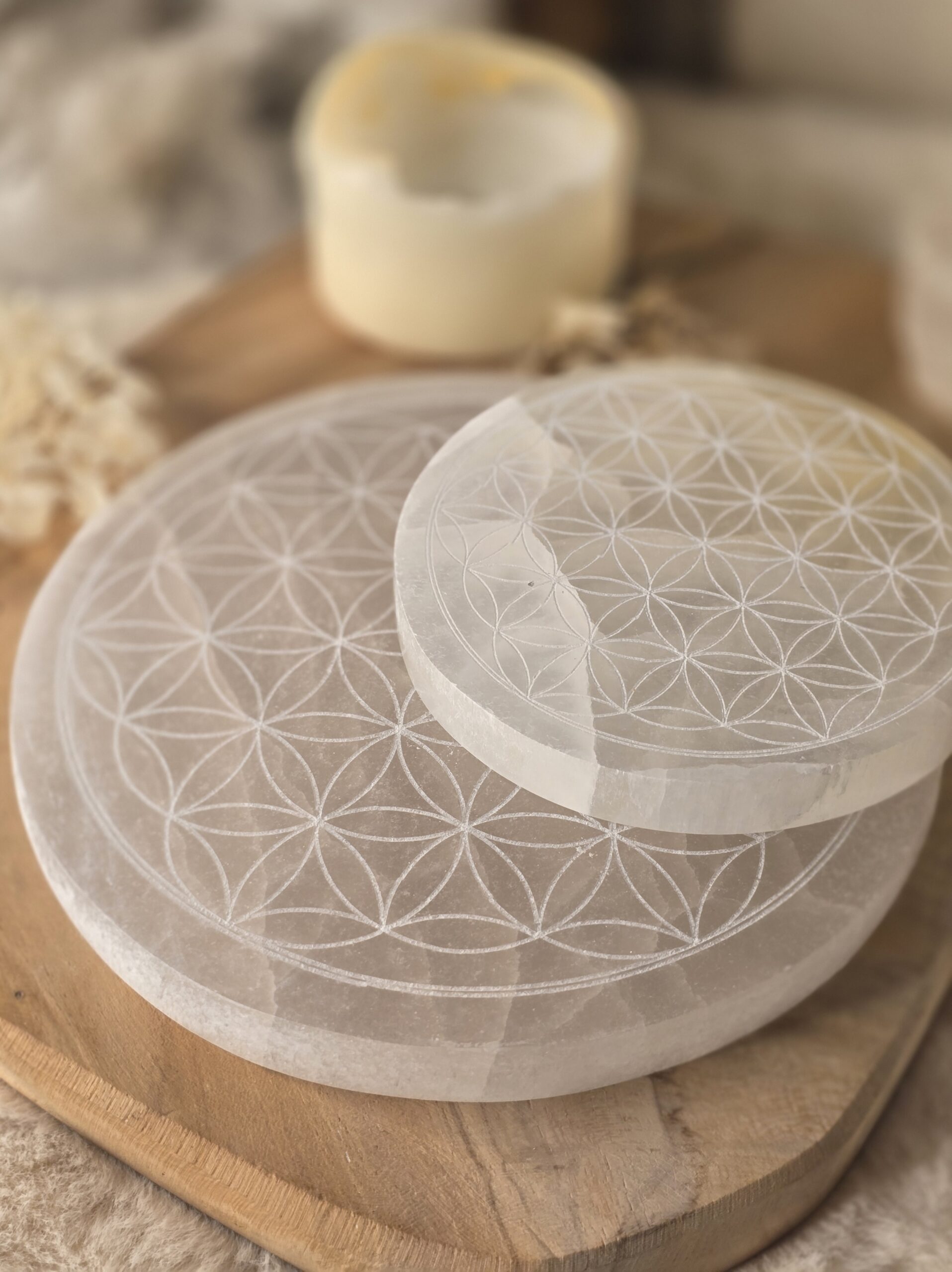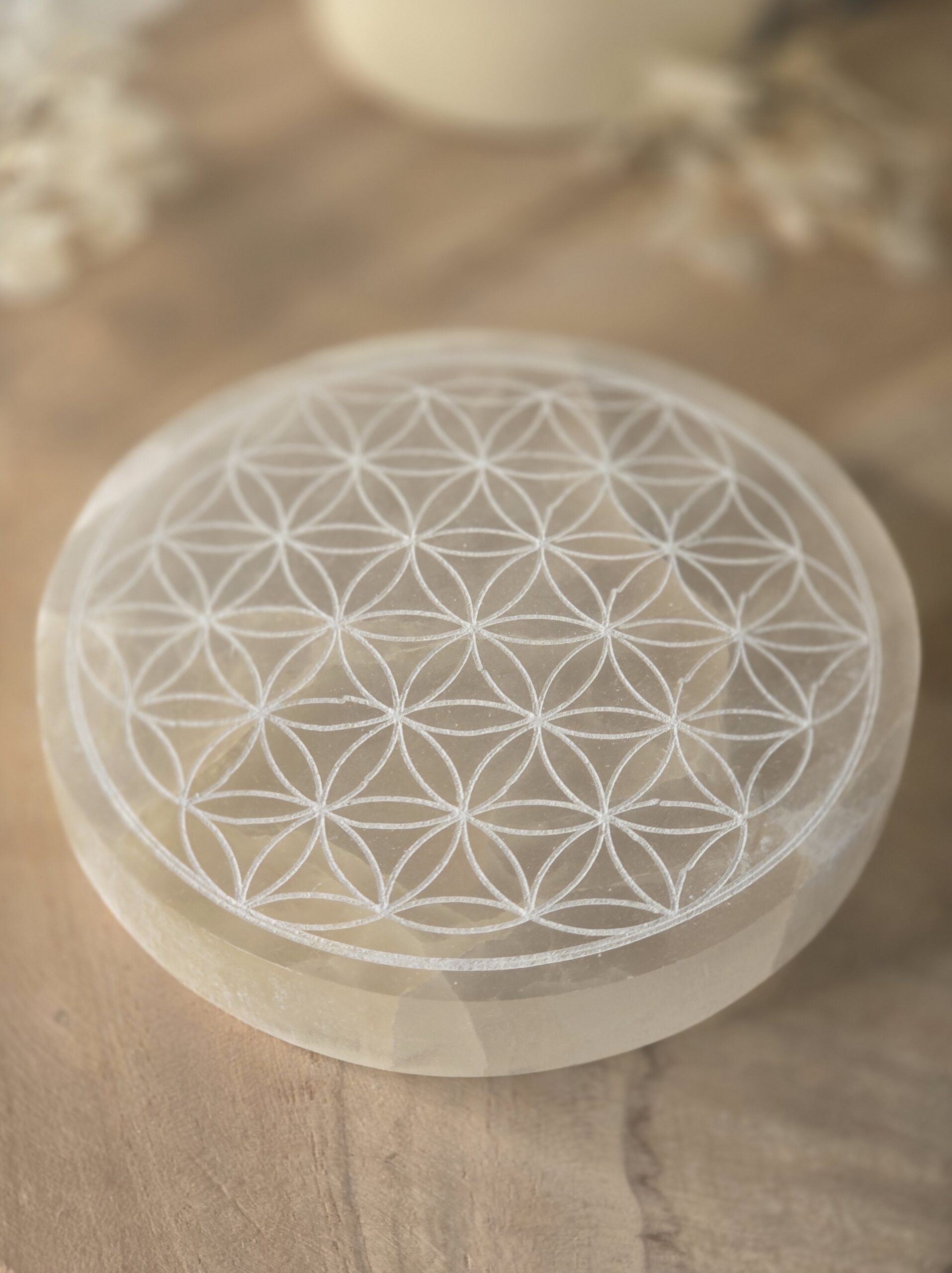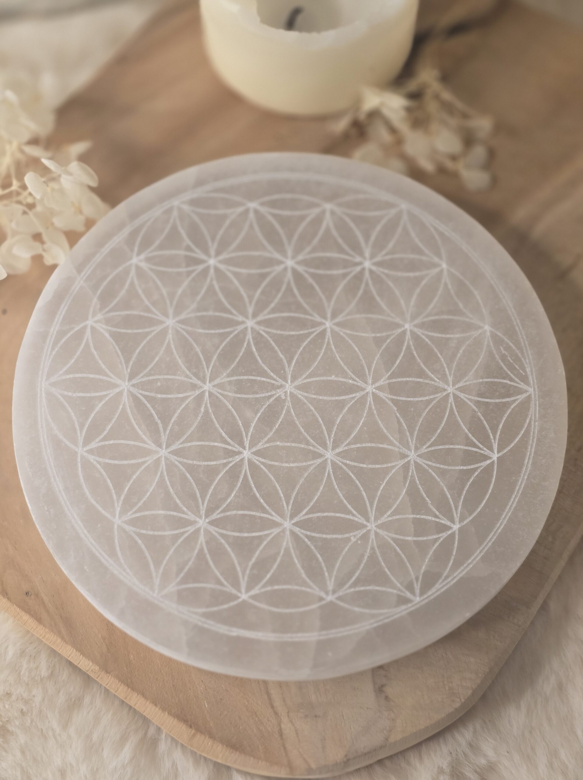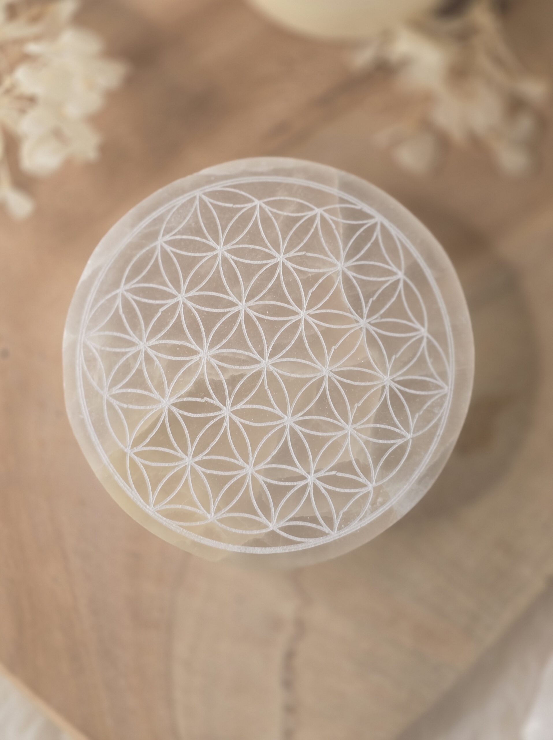Plaque de sélénite gravée Fleur de Vie-10 et 15 cm