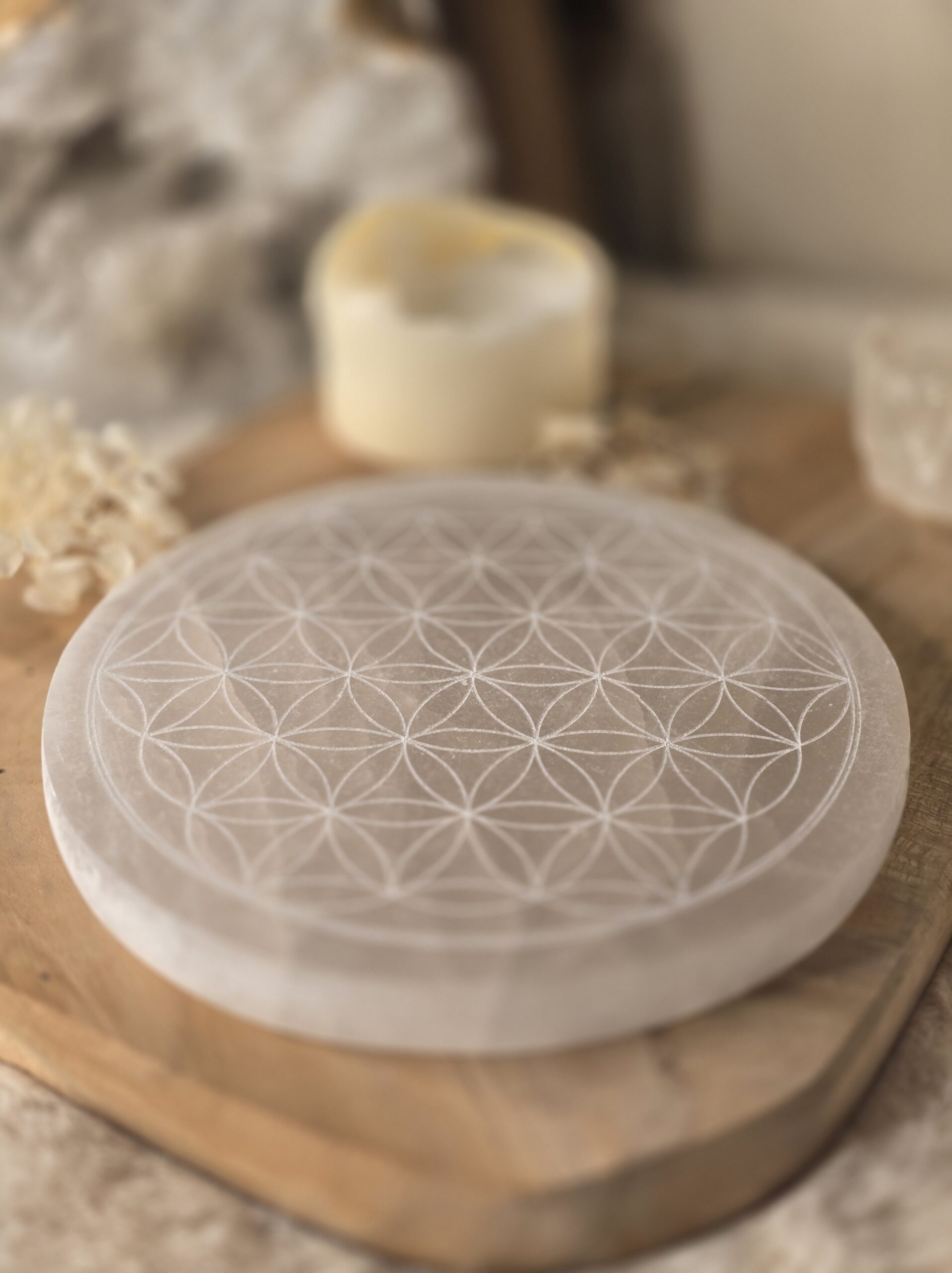 Pose tes autres pierres dessus une nuit — elles se purifient et se rechargent naturellement grâce à la sélénite et à la Fleur de Vie.